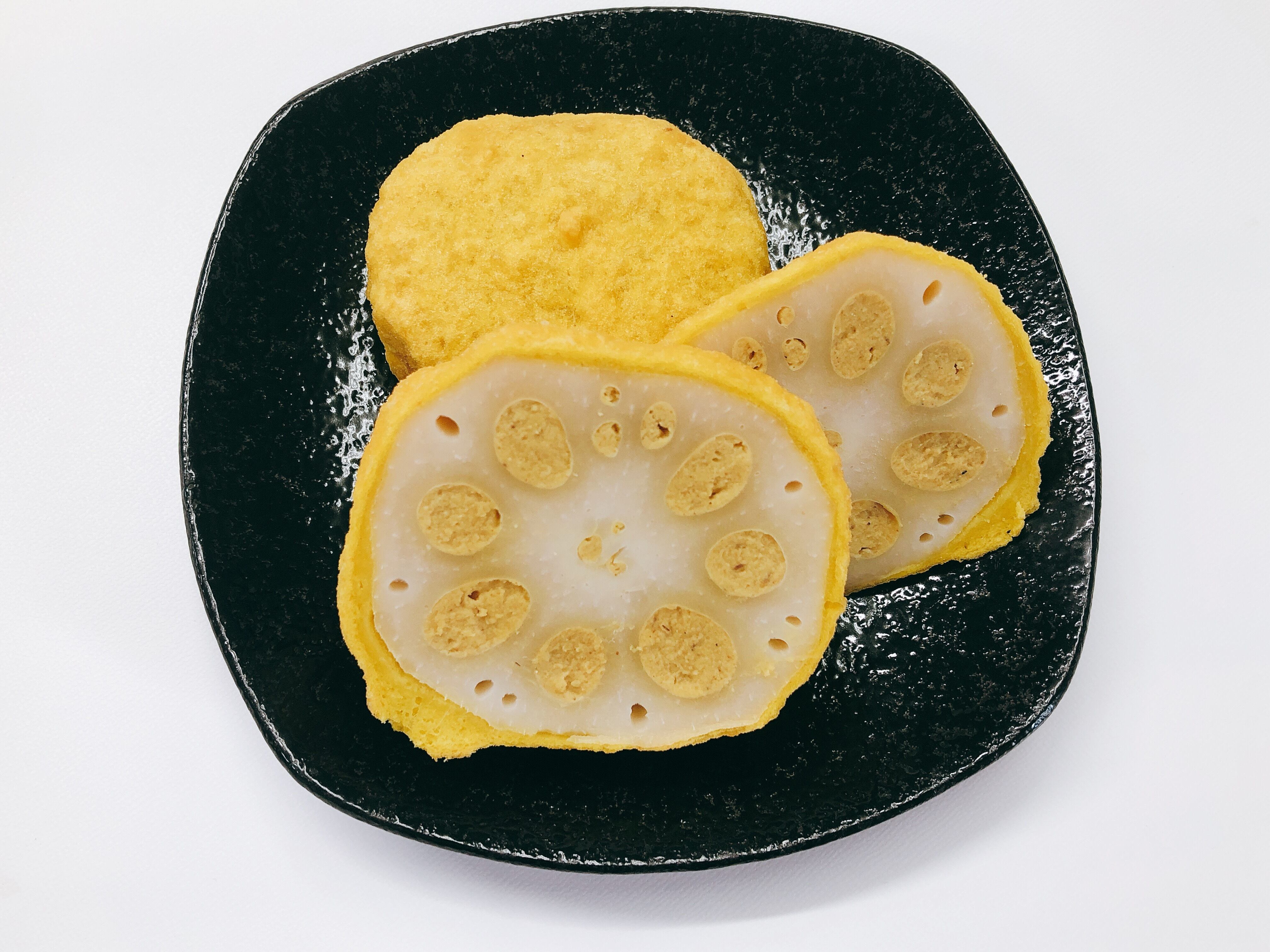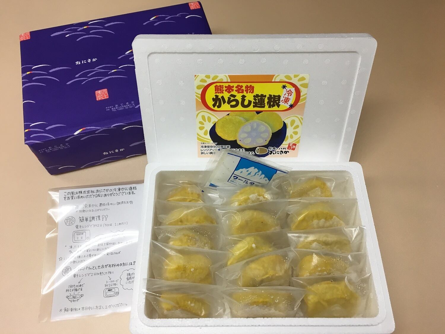 熊本名物からし蓮根が弊社独自の技術により冷凍で長期保存可能になりました。食べたいときにいつでもレンジアップするだけで出来立てのアツアツがお召し上がりいただけます。酒の肴にピッタリ。